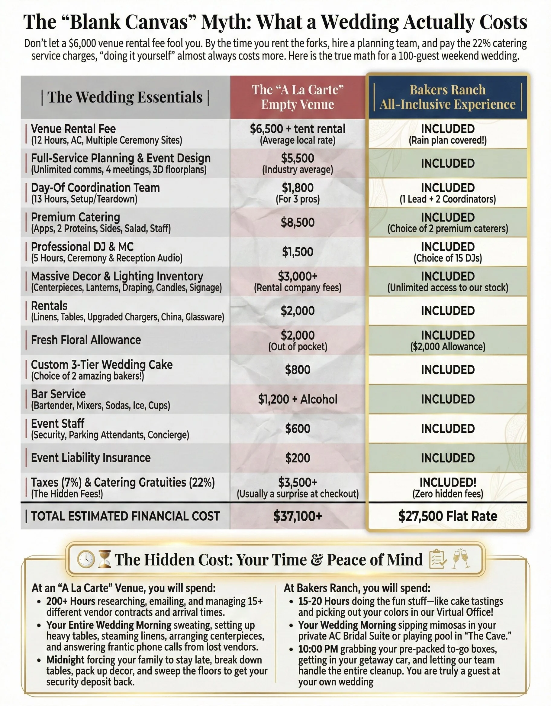 At Bakers Ranch, Florida’s Premier Top Rated All-Inclusive Wedding Venue, you will not have to worry about anything! You’ll get your Dream Wedding at a fraction of the average wedding cost!